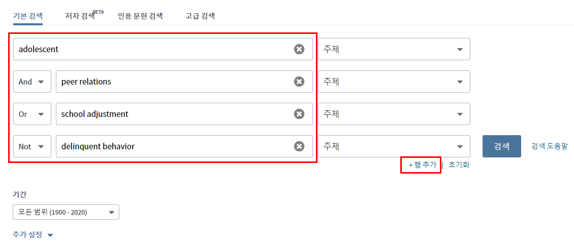 기본 검색에서 내가 찾고 싶은 키워드를 입력하여 원하는 논문을 검색할 수 있다. 보면 주제 아래 +행추가라는 부분이 있는데 이를 통해 보다 세부적인 키워드 설정이 가능하다. 예를 들어, 연구자가 adolescent라는 키워드에 peer relations를 추가하고 school adjustment는 들어가도 되고 안 들어가도 되며, delinquent behavior는 제외하고 싶다고 해보자. 그러면 아래 사진과 같이 키워드를 설정하면 원하는 검색 결과를 얻을 수 있다.