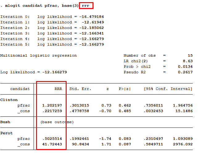 그러면 위의 사진과 같이 Bush가 base outcome으로 설정된 것을 확인할 수 있다. 물론 여기서 rrr이라는 옵션을 추가하여 승산값을 확인할 수도 있다.