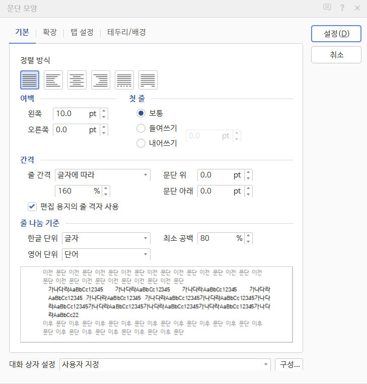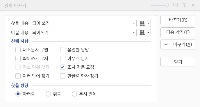 편집>찾기>찾아 바꾸기 기능을 활용하여 문서 작업 시 오타를 한 번에 정리할 수 있다. 문서를 작성할 때 한 단어에 대해 띄어쓰기를 통일되어 있지 않으면 독자로 하여금 전문성이 떨어진다는 인상을 줄 수 있다. 예를 들어, 띄어쓰기라는 단어에 대해 모두‘띄어쓰기’로 쓰거나 ‘띄어 쓰기’로 써야하지, 두 개를 번갈아 쓰면 안 된다는 것이다. 만약 한 단어에 대해 띄어쓰기가 통일되어 있지 않다면, 찾아 바꾸기 기능을 활용하면 된다. 위에 예시에서 ‘띄어쓰기’로 띄어쓰기를 통일하기로 하였다면, 찾아바꾸기 창을 열어 찾을 내용에는 ‘띄어 쓰기’, 바꿀 내용에는 ‘띄어쓰기’를 입력하여 모두 바꾸기를 클릭해주면 된다. 아래 사진을 자세히 살펴보면 선택 사항에 띄어쓰기 무시에 체크가 풀어져있는데, 이는 ‘띄어 쓰기’와 ‘띄어쓰기’를 다른 단어로 인식한다는 것을 의미한다. 만약 여기서 띄어쓰기 무시에 체크를 한다면 ‘띄어 쓰기’가 ‘띄어쓰기’로 바꿔지지 않을 것이다.