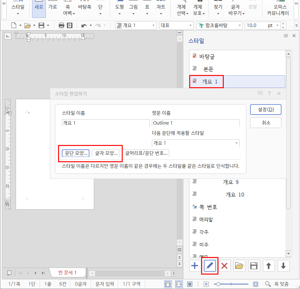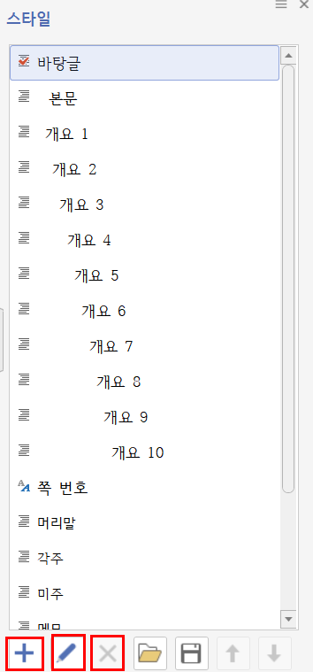 사진에서와 같이 여러 개의 스타일이 나와 있고, 맨 아래에는 스타일을 추가할 수 있는 + 아이콘, 현재 스타일을 편집할 수 있는 연필 모양의 스타일 편집 아이콘, 현재 스타일을 제거하는 엑스 모양의 스타일 지우기 등이 있다. 예시를 위해 개요1을 선택한 상태에서 스타일 편집 아이콘을 누르면 ‘스타일 편집하기’ 창이 뜬다. 해당 창에서 스타일 이름을 정할 수 있고, 스타일의 문단과 글자 모양, 글머리표/문단 번호를 편집할 수 있다.