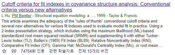 이번 포스팅에서는 구조방정식을 이용한 논문에서 자주 인용되는 선행연구들에 대해 살펴보고자 한다. 구조방정식을 이용하여 통계분석을 진행할 경우, 구조방정식 모형의 적합도를 평가하는 과정이 필수적으로 들어간다. 이 때, 모형의 적합도는 주로 적합도지수(RMSEA, CFI, TLI 등)에 의해 이루어지며, 이번 포스팅에서는 그러한 적합도지수의 기준들에 대해 정리한 선행연구들을 소개하고자 한다.